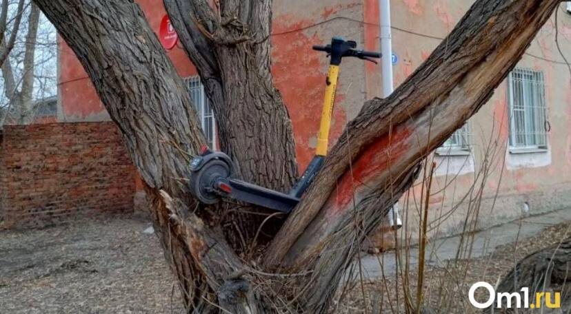 Сезон проката электросамокатов в Омске начался с акта вандализма: неизвестный умудрился забросить самокат компании «Вуш» на дерево. Инцидент зафиксировал портал Om1.ru.