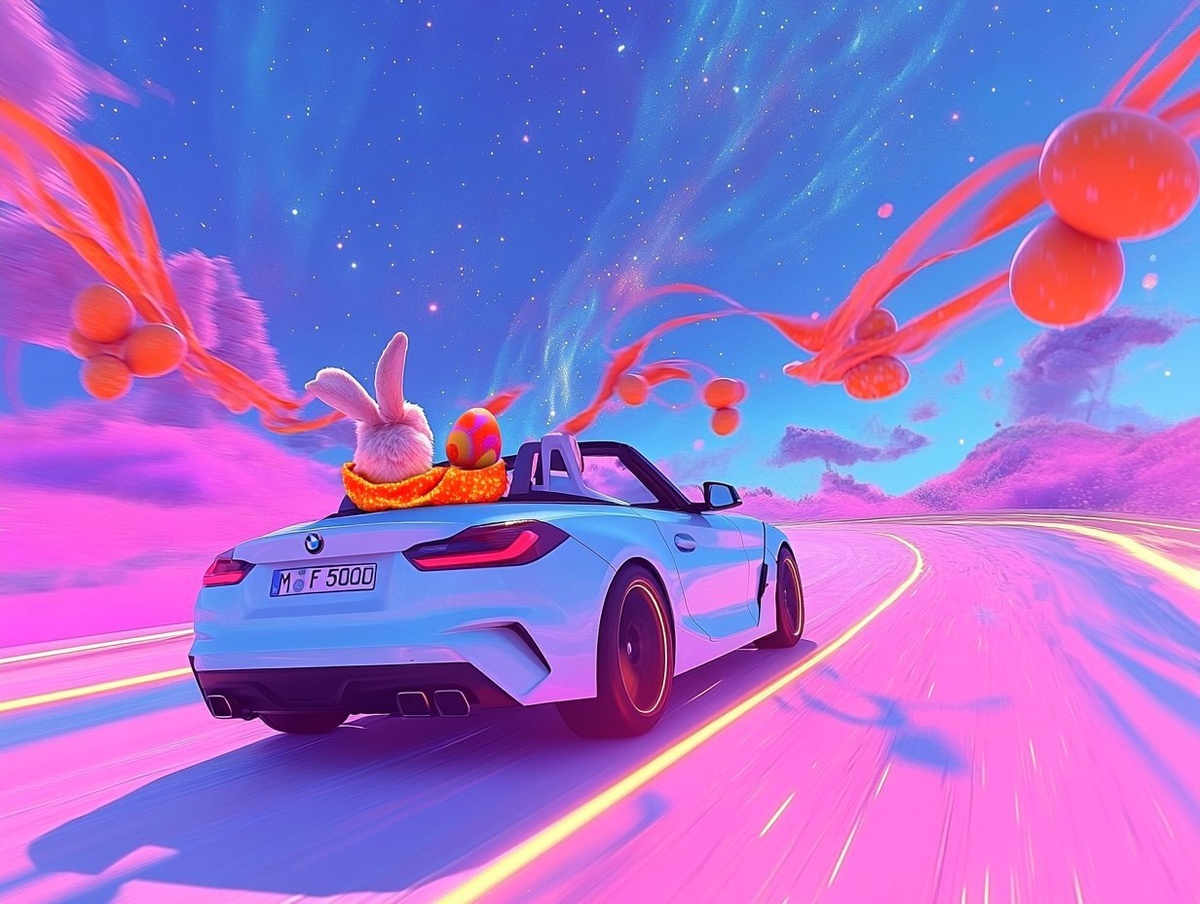 Создано на основе запроса: A surreal photorealistic scene featuring a BMW Z4 cabrio driving on a glowing road that stretches into a dreamy infinity horizon, an Easter bunny with a bright orange #FF5000 scarf sitting in the passenger seat, looking excited, surrounded by swirling orange winds carrying easter eggs, a vibrant spring landscape with starry sky, highly detailed, cinematic lighting with glow, 4k resolution
