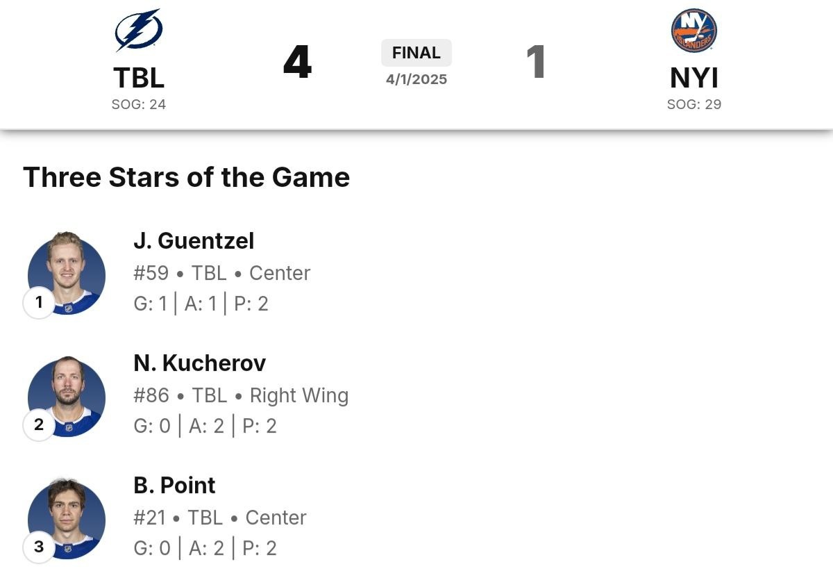 За свое продуктивное выступление 86-й номер «Лайтнинг» удостоился статуса второй звезды поединка против «островитян», завершившегося крупной победой (4:1) «молний».