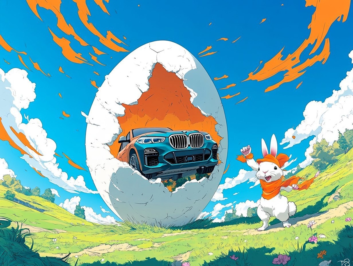 Создано на основе запроса: A playful comic-style illustration featuring a new BMW X5 rising from a giant Easter egg, cracked open in a vibrant spring meadow. The Easter bunny in a bright orange #FF5000 hat cheering beside the giant egg, surrounded by swirling orange winds carrying blooming flowers, a spring landscape with green hills and a bright blue sky, dynamic and humorous composition, highly detailed, comic book art style with bold outlines and strokes, 4k resolution