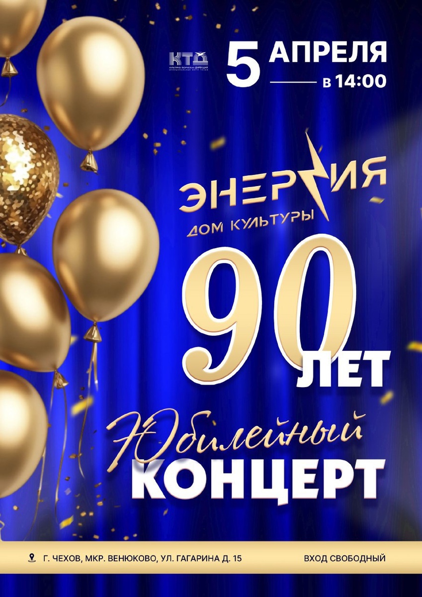 ✨ Юбилейный концерт, посвящённый 90-летию Дому культуры "Энергия" в мкр-не Венюково 🎈Вас ждёт выступление лучших коллективов ДК "Энергия", а так же творческие номера от друзей. Приходите🎉 🚫 Возраст: 0+ 📆 05.04.2025 🕛 14:00 🏢 ДК «Энергия» 📍 г.о. Чехов, ул. Гагарина, д.15 🪙 Вход свободный❗️ #webЧехов ✅ Мероприятия Чехов https://dzen.ru/id/66cc4b48e9ef144699238a51 http://vk.com/chekhov_events http://dzen.ru/chekhov_events