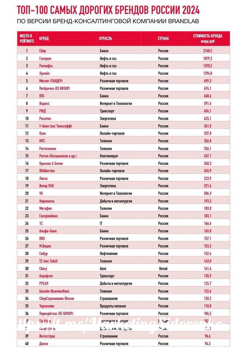 ТОП-100 самых дорогих брендов России Ребята из BRANDLAB опубликовали свежий рейтинг стоимости крупнейших российских компаний. В тройке лидеров — Сбер, Газпром и Роснефть. Логично: банковский сектор и нефтянка всегда в топе. Но не всё так очевидно. В списке Яндекс, Wildberries, VK, Ozon и ещё десятки компаний из e-commerce, IT, телекомма, розницы и страхования. В общей сумме — 18 триллионов рублей стоимости брендов из списка. Да, вы всё правильно поняли — это список ваших идеальных заказчиков. #бренды #Россия #Сбер #Газпром #Роснефть #ecommerce #IT