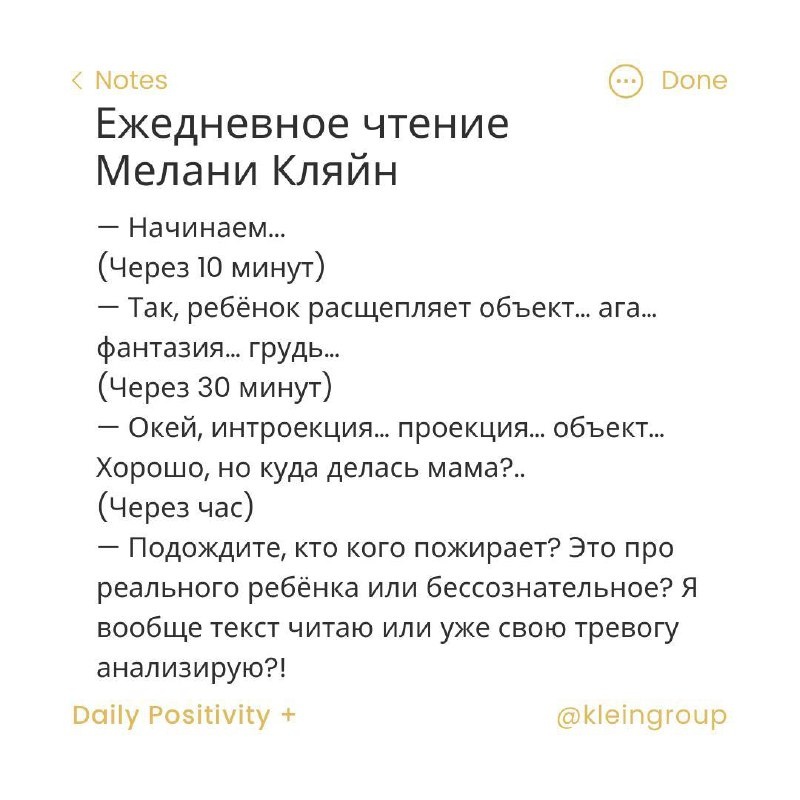 Следующей статьёй, которую мы будем читать, будет «Торможения и трудности в пубертате» Мелани Кляйн. Это короткий, но насыщенный текст, который открывает важные аспекты подросткового развития. Мальчиков. Я читаю Мелани Кляйн много и часто. Иногда — вперёд, иногда — фрагментами. Но каждый раз, когда возвращаюсь к её ранним статьям, я вдруг вижу: насколько глубже стало моё понимание. Как будто сдвинулась внутренняя оптика. Что-то, что раньше казалось сухим, вдруг начинает дышать. Это происходит не потому, что текст изменился — а потому, что изменилась я. Когда вы читаете Мелани Кляйн, не торопитесь. Лучше всего — в несколько заходов. Первый раз — просто прочитать. Второй — отметить, где вы чувствуете сопротивление, непонимание или внутренний отклик. И только потом — возвращаться к этим местам с вопросом: а о чём она говорит внутри меня? Иногда легче понять не «что она говорит», а откуда она говорит — из какой позиции, какой боли, какой наблюдательности. Одно из пониманий, которое мне