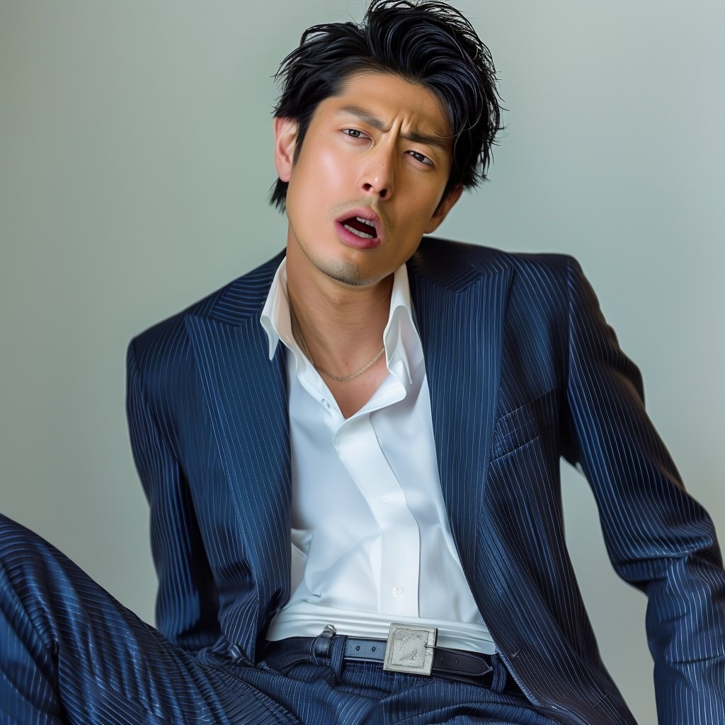 Создано на основе запроса: Shiny navy suit, belt, standing