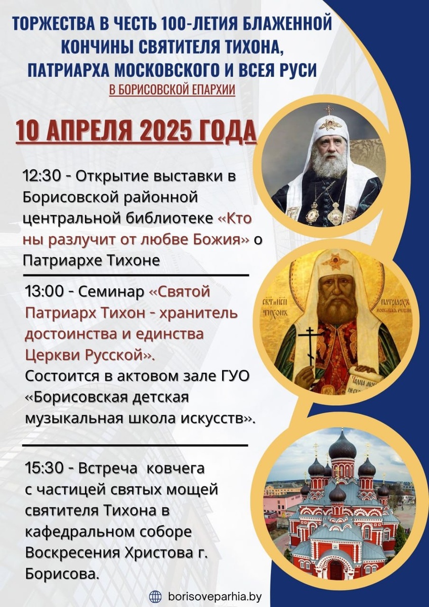 https://borisoveparhia.by/novosti-eparhii/v-borisovskoy-eparkhii-sostoyatsya-torzh.html?_utl_t=tm В Борисовской епархии состоятся торжества в честь 100-летия блаженной кончины святителя Тихона, Патриарха Московского и всея Руси - БОРИСОВСКАЯ ЕПАРХИЯ