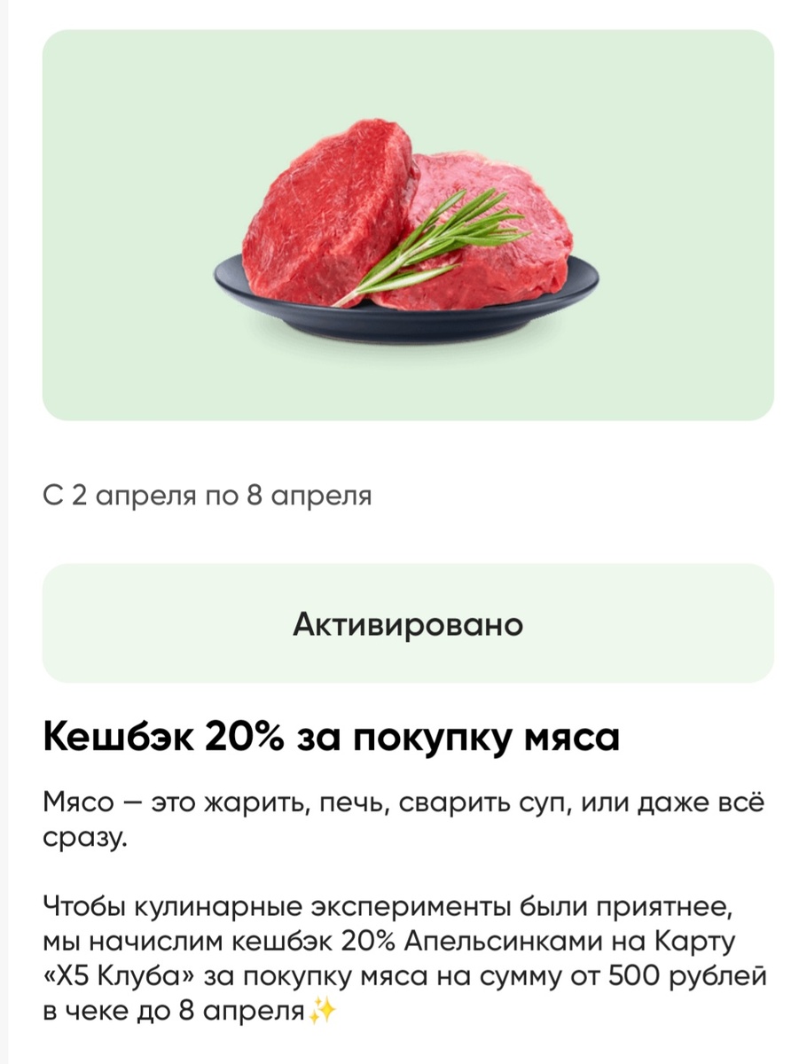 в приложении предложили 20% кешбек на мясо - свинину и говядину и 20% на сыр, а также 20% на молоко. Я как раз планировала закупать мясо и сыр в этом магазине. Заодно оплачиваю по карте Альфа с 12% кешбеком 🤩 Мяса купила около 7 кг. Правда, Перекрёсток хитрит: кешбек они начисляют максимум 3000 апельсинок (т.к. 300 руб). Но в итоге по чеку получился приличный кешбек за разные категории продуктов. до 13 апреля у них идет акция со 100% кешбеком на готовую Итальянскую еду. Мы покупали три блюда, получили за них 100% кешбек. А благодаря тому, что оплатила я по карте с кешбеком, получается, что нам еще и приплатили за эти блюда 😄 мы покупали лазанью, фетучинне с грибами и курицей и баклажаны болоньезе В приложении Пятёрочки на главной странице дали индивидуальные предложения на сыр и печенье. Купила, апельсинки начислили. Например, на сыр: нужно было купить на сумму от 250 руб, я купила сыр за 260 руб, а начислили мне за него 170 руб (=1700 апельсинок) Также купила печенье и вафли на 2