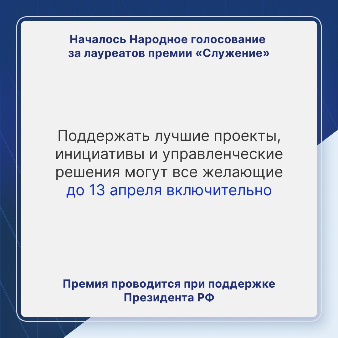 Выберем лауреатов премии «Служение» вместе! 🤝 Она присваивается служащим, которые внесли особый вклад в развитие муниципальных образований и повышение качества жизни граждан 📈 Чтобы принять участие в голосовании, нужно: 🔹 авторизоваться на платформе «Госуслуги» 🔹 на странице «Решаем вместе. Голосования» перейти в раздел «Народное голосование в рамках Всероссийской муниципальной премии «Служение» В каждой из номинаций можно выбрать один проект!