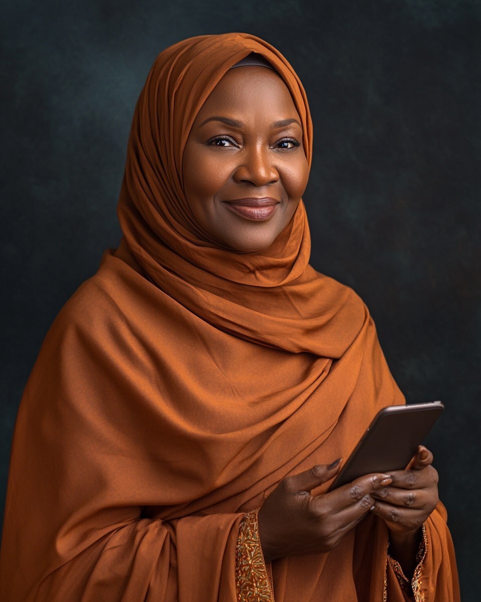 Создано на основе запроса: A photorealistic portrait of a distinguished Hausa woman, around 50 years old, with rich melanin skin, wearing a plain-colored hijab and traditional Hausa attire, holding a smartphone while smiling warmly, standing against a simple, neutral background with professional and elegant lighting, high detail, ultra-realistic