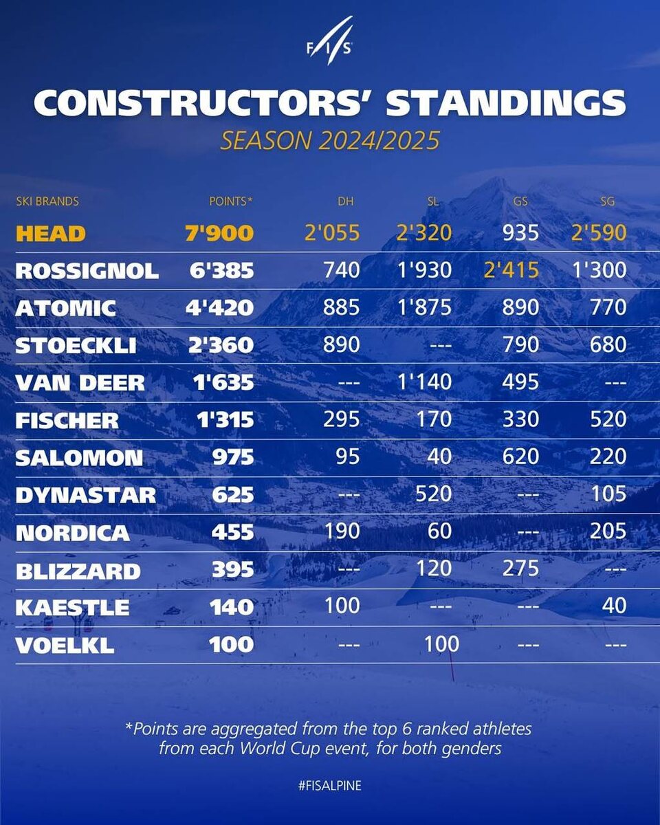 Итоговый зачет Кубка Конструкторов 24/25⚡️ Рейтинг производителей по итогам сезона. 🔥Команда HEAD побеждает в общем зачете по сумме очков сезона и в трех дисциплинах. 🔥ROSSIGNOL занимает второе место, и побеждает по сумме очков в слаломе-гиганте! 🔥ATOMIC занимает третье место и уступает лишь 55 очков в зачете по слалому. Очки суммированы по 6 лучшим спортсменам с каждого этапа Кубка Мира и по каждой дисциплине. 🔗Каталоги брендов 25/26 🔗amdsports.ru
