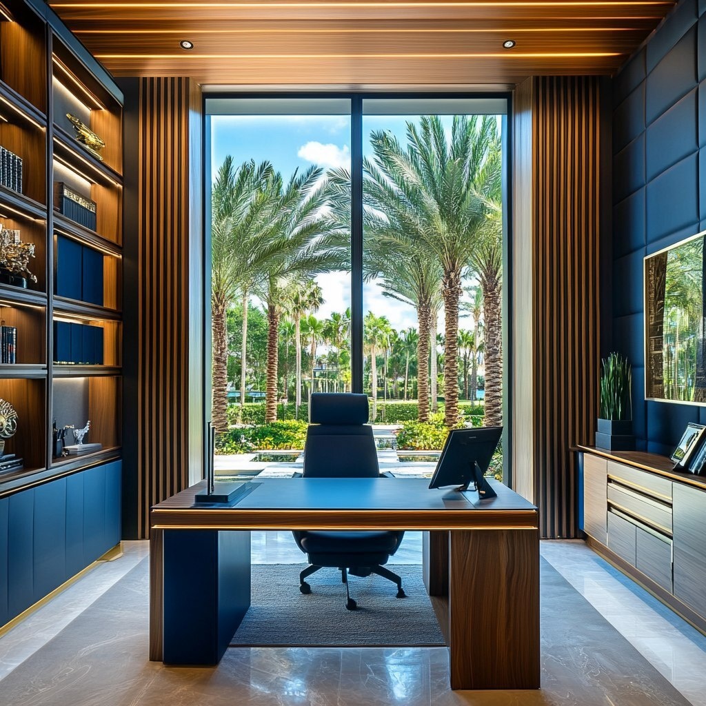 Создано на основе запроса: office facing the window on the back wall with the desk sideways in all blue and around the tall window is acoustic slat wood, modern, out window 1st floor Florida palm trees desk is in accent wood, luxury with really good interior lighting, acoustic slats on ceiling matching wall --- Автоперевод: Офис обращен к окну на задней стене с столом сбоку во всем синем, а вокруг высокого окна находится акустическое дерево с плащником, современное окно 1 -й этаж. Как тебе картинка? 🤔 https://dzen.ru/id/65c0c65c86e4f837c27b24d7 #ИИ #AI #нейросеть #midjourney #art