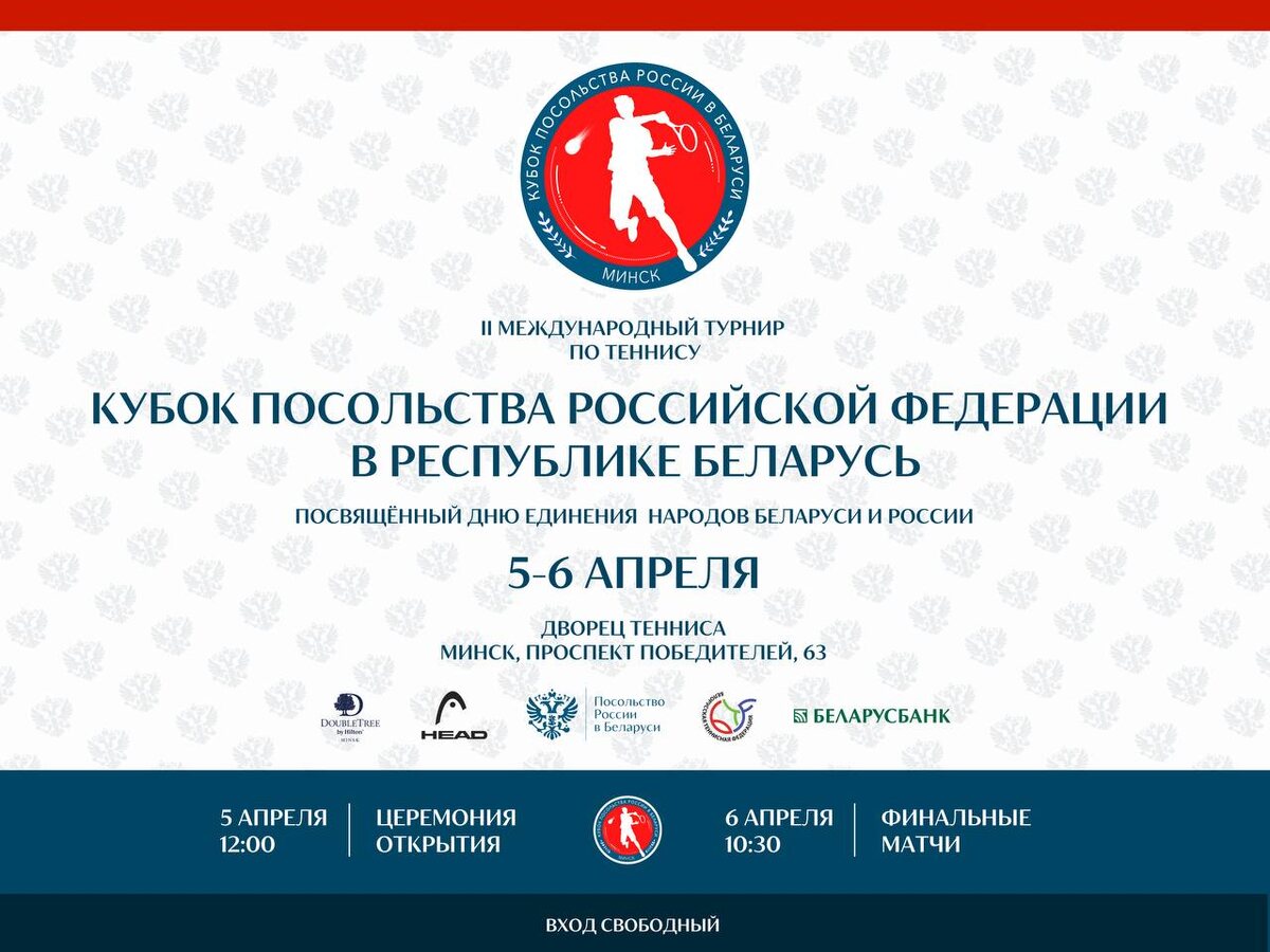 В рамках празднования Дня единения народов Беларуси и России на кортах Дворца тенниса встретятся 16 пар спортсменов В Минске 5-6 апреля на одной из главных спортивных площадок страны — во Дворце тенниса Республиканского центра олимпийской подготовки — пройдет II Международный турнир по теннису на Кубок Посольства Российской Федерации в Республике Беларусь. Это событие приурочено к Дню единения народов Беларуси и России и обещает стать ярким спортивным праздником.