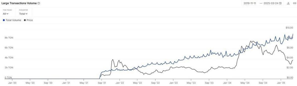 ↗️TON бьёт рекорды: $34,28 млрд. крупных транзакций за неделю Смотрите, что происходит: 🟢Гигантские объёмы — 9 млрд TON ($34 млрд!) переведено за неделю 🟢Это не спекулянты — такие суммы двигают только киты и институты 🟢Сеть взрослеет — TON теперь серьёзная площадка для больших денег 🟢Что дальше? Скорее всего, готовят почву для чего-то масштабного