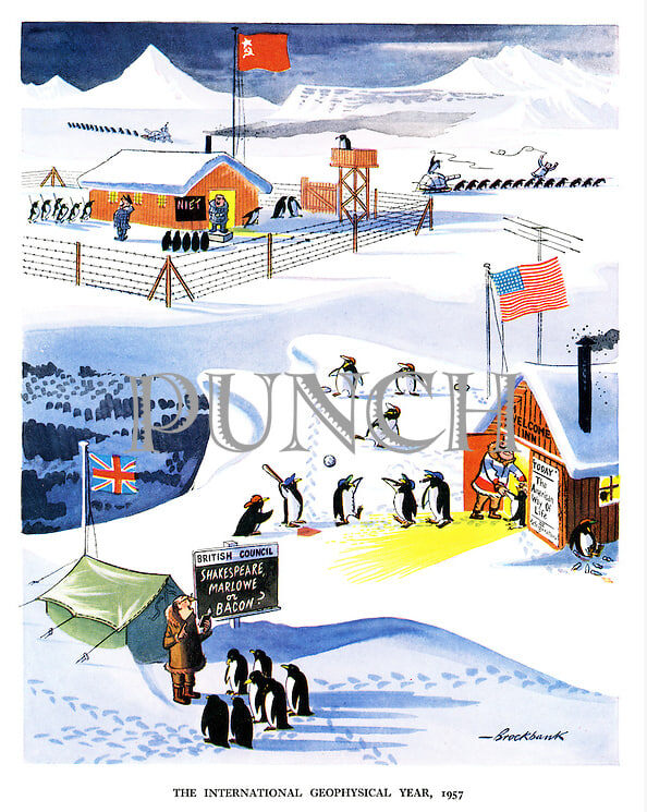 В 1957 году карикатурист Расселл Брокбанк в британском сатирическом журнале Punch разместил карикатуру на Международный физический год. Здесь изображены антарктические лагери трёх сверхдержав с группами пингвинов. СССР изображён как ГУЛаг: колючая проволока, пингвины ходят строем, на заднем фоне танки в форме иглу с запряжёнными пингвинами. Американские пингвины играют в бейсбол, и всё вроде замечательно, но один пингвин на задворках лежит пьяный в окружении початых бутылок. А ещё они воздух загрязняют, судя по чёрному дыму из трубы. Я никак не могла понять, что с британскими пингвинами не так. Ну понятно, журнал-то британский. Безупречные пингвины изучают литературу и философию. Но потом пригляделась и увидела кладбище. Потом вспомнила экспедицию Роберта Скотта и про то, как он при наборе команды делал акцент на том, что участники должны быть джентльменами. И решила, что бичом англичан на картинке представлен примат культуры над способностью выживать. А вы согласны с карикатурой? Подп