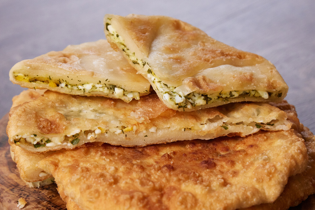 Ингредиенты: Для теста: Мука 370 г Вода 200 мл Подсолнечное масло 2 ст. ложки 35 мл Столовый уксус 9% 1 ст. ложка Соль ½ ч. ложки Для начинки: Творог зернёный рассыпчатый 5% 320 г Яйца 2 шт. Петрушка 15 г Укроп 15 г Подсолнечное масло 100 мл Соль Приготовление: 1.В большую миску отправить муку (350 г) и щепотку соли. В воду влить уксус (1 ст. ложку) и подсолнечное масло (2 ст. ложки), перемешать и влить к муке. Замесить тесто руками до однородной консистенции. Переложить в миску и накрыть полотенцем, дать отдохнуть 30 минут. Совет от шефа: «Для того, чтобы тесто получилось эластичное, нужно добавить уксус и подсолнечное масло». 2. В отдельную миску отправить творог, добавить мелко нарезанные петрушку и укроп. 3. Яйца заранее отварить в крутую, остудить и очистить от скорлупы. Натереть на крупной тёрке к творогу, посолить по вкусу и перемешать. 4. Тесто разделить на 4 части и скатать в шарики. На стол насыпать 20 г муки на подпыл и раскатать шарик скалкой в лепёшку несколько мм толщиной