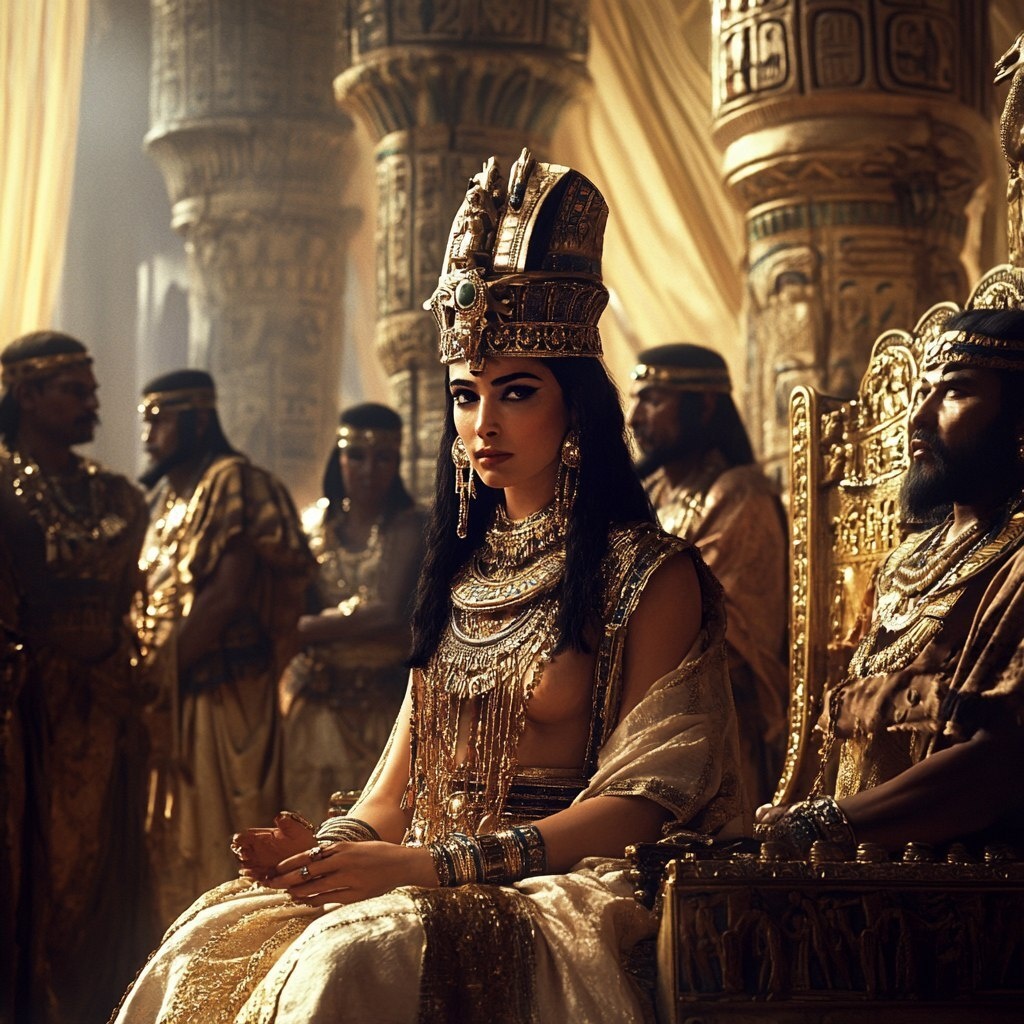 Создано на основе запроса: young Beauty Cleopatra, straight hair,the legendary Egyptian queen, sitting gracefully on a golden throne, adorned with exquisite jewelry and a majestic headdress. Surrounding her are Egyptian priests, dressed in Roman and Egyptian attire, some bowing in reverence, others engaging in conversation. The scene is illuminated by flickering torchlight, casting dramatic shadows on the opulent palace walls. Luxurious silk curtains sway gently in the background, emphasizing the grandeur of ancient Egypt. Highly detailed, cinematic lighting, ultra-realistic, 8K, masterful composition, historical accuracy.
