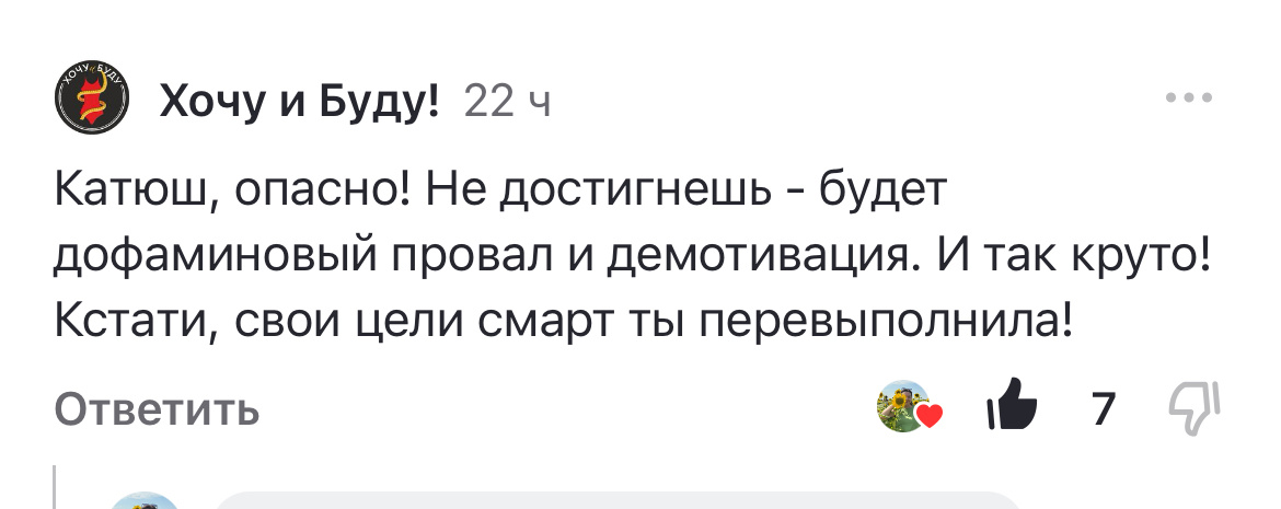 Приветствую, друзья и гости моего канала. Иду к цели, осталось 250 грамм, если не зальет, то к субботе увижу заветную цифру 69😂 Оказывается цели, которые я ставила на проекте уже даже перевыполнены, это у меня с памятью туго. Вот, Вика сегодня в комментариях написала. Цель была минус 5 кг и минус 6 см в талии. По итогу уже больше, почти минус 6 кг и 8 см в талии. Это, видимо, у меня в голове отложилось, что хочу цифру 69, на нее и держу ориентир. Нет, конечно, приятно будет, если я ее увижу и отчет отправлю в субботу с новым десятком. Но, я итак молодец. Не все зависит от нас, вес не предсказуемая штука. Потом прилетел такой комментарий Хочу пояснить, про занижение калорий, если бы изначально я пришла на проект, а не сама худела и в первую неделю моя калорийность была 2000, то возможно мне и снизили бы до 1800. С так как я питалась год на 1600, а потом сама себе снизила до 1500, конечно пришлось немного подрезать. Но опять же куратор мне их быстренько и вернул, буквально месяц было 14