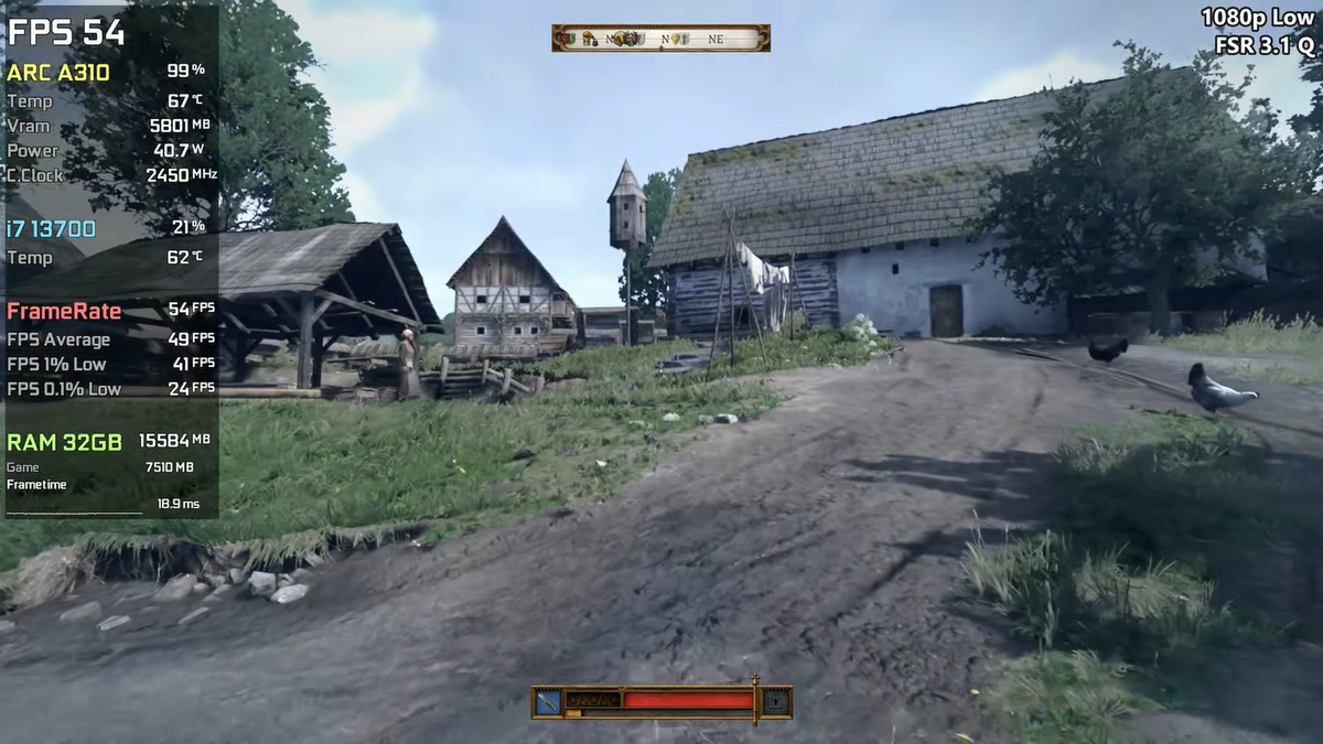В одном из выпусков на YouTube-канале EDWARD Gaming продемонстрировали, как в 720p, 900р и 1080р ведёт себя Arc A310. Assassin’s Creed Shadow шла в 720p с низким пресетом, FSR Quality. Средняя производительность здесь составляла 36 к/с. Black Myth: Wukong запускалась тоже в 720p с графикой Low, FSR Quality, FG. В среднем удалось получить в этой игре 57 к/с. Counter-Strike 2 тестировалась в разрешении 1080p и с пресетом Low. Средний FPS в ней составлял 133 к/с. В игре Cyberpunk 2077 в 1080p с графикой Medium, FSR Balanced, FG средняя частота кадров находилась на уровне 65 к/с. Ghost of Tsushima шла в 900р с пресетом Very Low, FSR Quality, FG. В среднем производительность в этой игре равнялась 45 к/с. God of War: Ragnarok тестировалась в 1080р с графикой Low, FSR Balanced, FG. В среднем здесь частота кадров составляла 55 к/с. Grand Theft Auto V Enhanced запускалась в FHD с высокой графикой, FSR Quality. Средняя производительность здесь составляла 64 к/с. Inzoi шла в 1080р с низким пресет