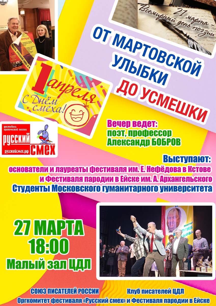 Кондрашов Александр, 3 курс Вот уже который год в малом зале Центрального Дома Литераторов, профессор, поэт и публицист Александр Александрович Бобров проводит творческий вечер. Но в этот раз он был посвящён не весеннему дню поэзии, как это бывает ежегодно, а русским ироническим стихам и прозе, под названием - «От мартовской улыбки до усмешки». Вместе с Александром Александровичем на мероприятии был его соведущий, поэт-пародист Олег Захаров. На полном смеха и улыбок вечере, выступили лауреаты фестиваля пародии в Ейске, имени русского литератора Александра Николаевича Архангельского, а также Всероссийского фестиваля иронической поэзии «Русский смех», который проводится с 2007 годав городе Кстово, Нижегородской области. К слову, автор идеи - журналист и поэт Евгений Андреевич Нефёдов, к сожалению, уже ныне покойный. Но давайте не будем о грустном. Победители прошлогодних фестивалейнашли время приехать и продемонстрировать свои таланты в области пародии, иронической и юмористической поэз