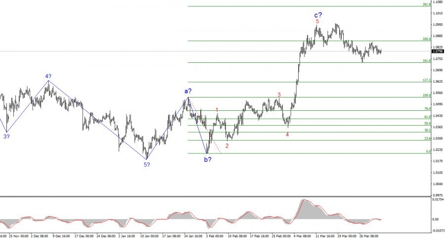Волновая разметка 4-часового графика для инструмента EUR/USD грозит трансформироваться в более сложную структуру. 25 сентября прошлого года началось построение новой понижательной структуры, которая приняла импульсный, пятиволновой вид. 3 месяца назад началось построение восходящей коррекционной структуры, которая должна состоять минимум из трех волн. Волновая структура первой волны получилась достаточно красивой, поэтому я продолжаю рассчитывать, что и вторая волна получит четкий вид. Однако размер этой волны настолько велик, что есть угроза серьезной трансформации волновой разметки.