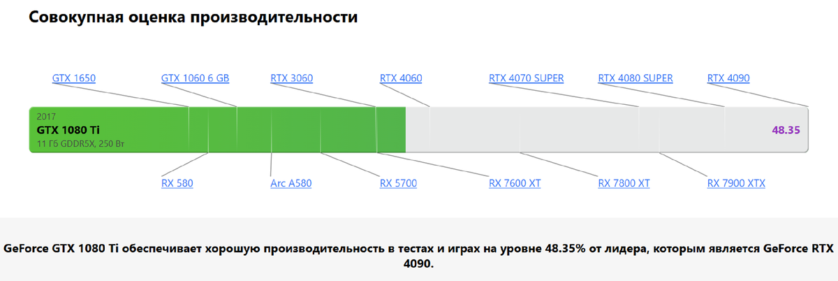 Если подытожить, то такая длинная карьера 1080 Ti – это результат хорошей работы в 2016 году (карты вышли очень мощными), затем результат плохой работы в последующие годы (RTX 30 хоть и сильно быстрее, чем RTX 20, сравнивать надо не топовые видеокарты, а средние. Там разницы около 10-15%), помноженный на внушительный объем видеопамяти.