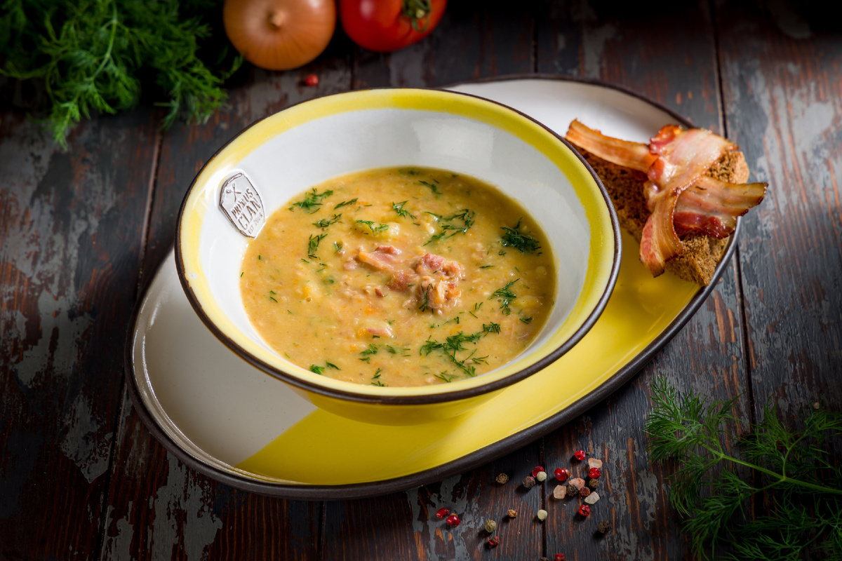 5 апреля отмечается День супа. К празднику предлагаем вам рецепт супа от ресторана «Ян Примус» Ингредиенты: • Лук – 1 луковица. • Морковь – 1 шт. • Сельдерей – 1 стебель • Чеснок – 2–3 зубчика • Лавровый лист – 2 шт. • Соль и свежемолотый чёрный перец – по вкусу • Вода – 2–2,5 л • Дополнительно: немного растительного масла для обжарки овощей, свежая петрушка для подачи Способ приготовления: 1. Подготовка гороха: Горох промыть, залить холодной водой. Оставить на ночь. 2. В большую кастрюлю налить воду, погрузить порезанную произвольными кусочками говядину, варить на среднем огне, снимая пену. Далее заложить лавровые листья и немного посолить. 3. Слить воду с гороха и добавьте его в кастрюлю. Варить на среднем огне около 1–1,5 часов до полуготовности мяса и гороха. 4. Пока варится мясо на сковороде разогреть немного растительного масла и обжарить лук, морковь, резанные мелким кубиком, до золотистого цвета. 5. Добавить в кастрюлю обжаренные овощи и измельчённый чеснок, свиные ребра. Продо