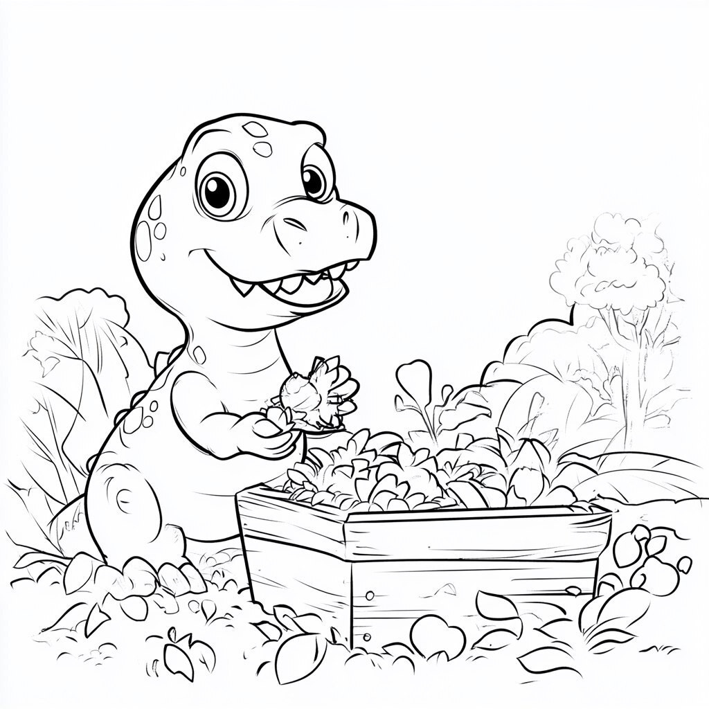 Создано на основе запроса: a cute coloring page for children featuring a dinosaur doing some gardening