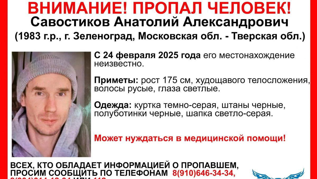 В городе Зеленограде Московской области пропал 42-летний Анатолий Александрович Савостиков. Как сообщает тверской волонтерский поисково-спасательный отряд "Сова", с 24 февраля местонахождение мужчины неизвестно. Есть информация, что он может находиться в городе Твери.