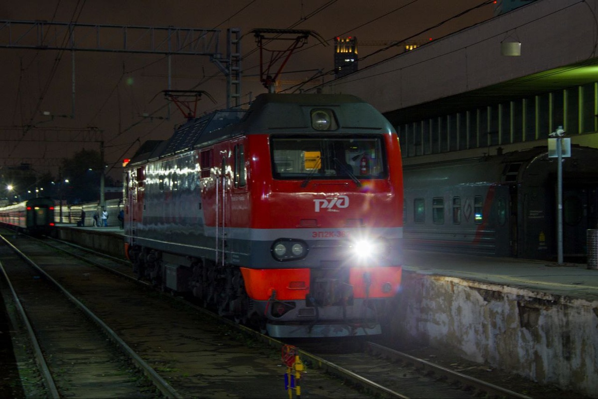 Один привёз, другой увёз Поздним вечером на Павелецкий вокзал прибыл электровоз ЭП2К-362 с международным поездом «Ташкент - Москва». Пока пассажиры высаживались, электровоз отцепился от состава, и в хвост прицепился тепловоз ТЭМ18ДМ-1921, который увез состав на отстой. г. Москва, Павелецкий вокзал | 05.10.2024 г.