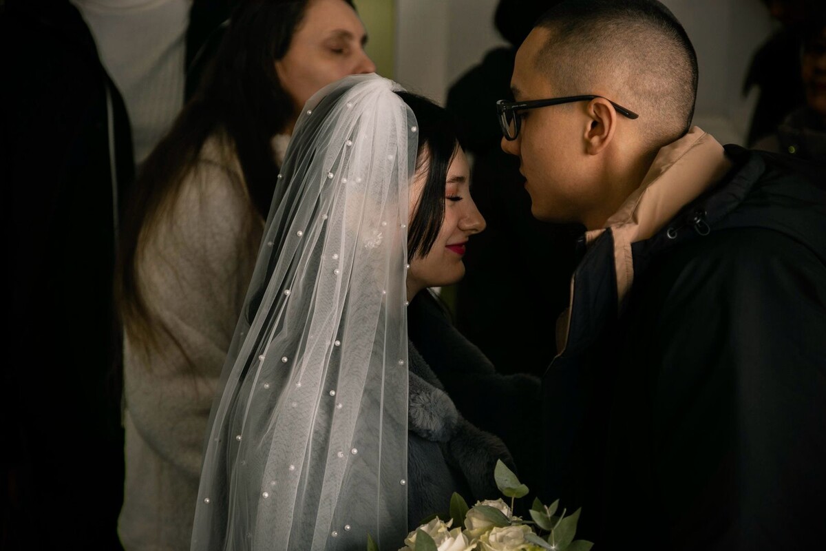 Сначала пару молодожёнов с гостями пропускают в здание и просят подождать приглашения)
