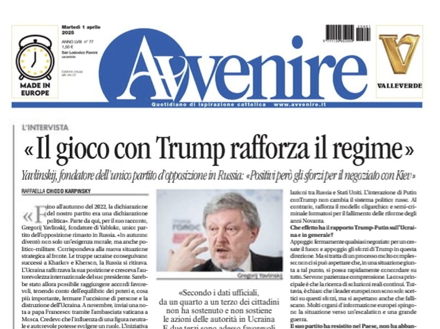 Григорий Явлинский в интервью итальянской газете Avvenire рассказал о том, как осенью 2022 года обращался к главе католической церкви с предложением о прекращении огня между Россией и Украиной, ответил на вопросы о российско-западных отношениях и оценил шансы на позитивные перемены в России. Публикуем полный текст интервью на русском языке.