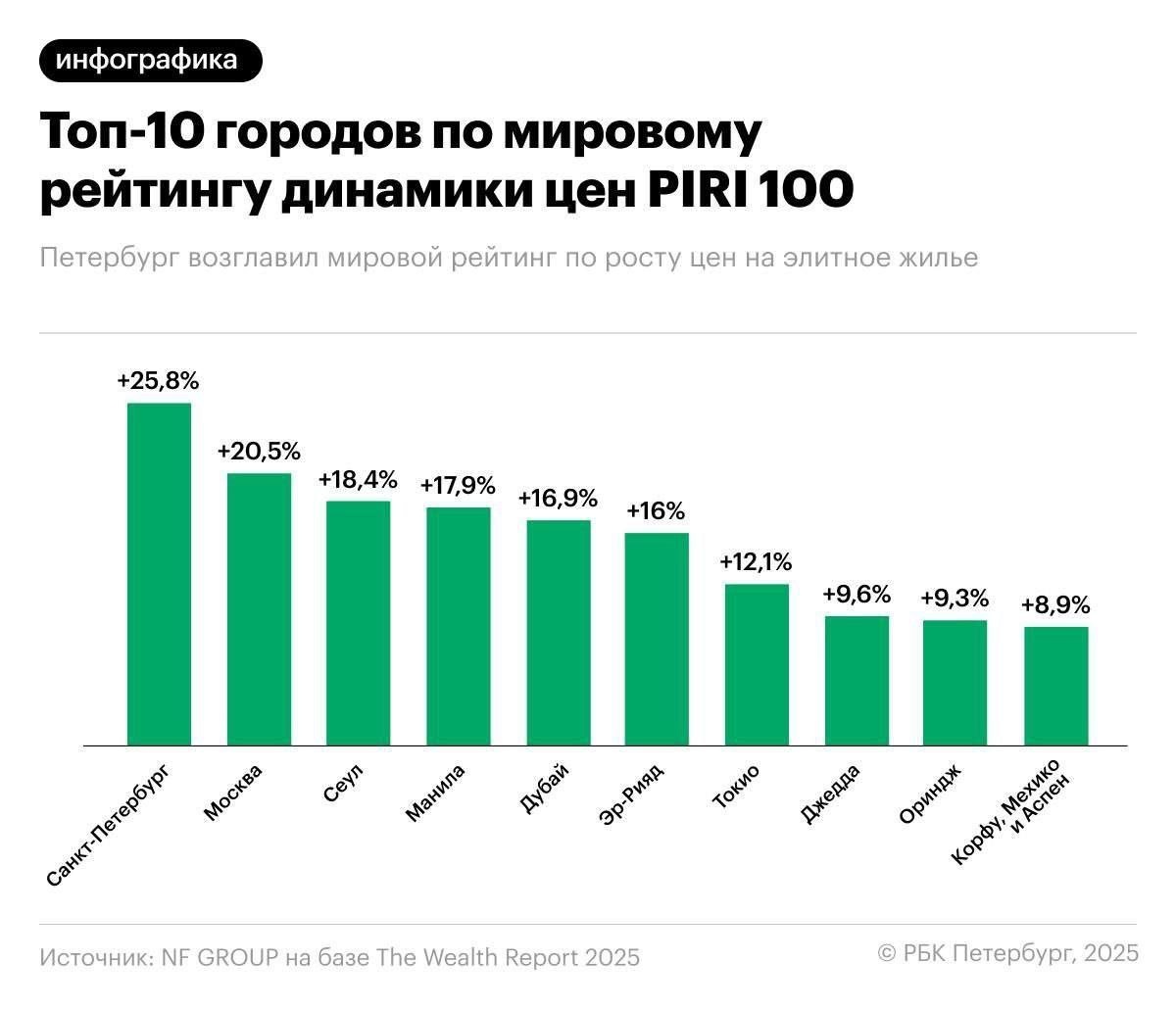 Возможно неожиданно, но — в северной столице. Knight Frank опубликовал отчет The Wealth Report 2025, в котором рассматривались показатели за прошедший год. Санкт-Петербург занял первое место в мировом рейтинге по росту цен на премиальное жилье. Цены в сегменте выросли на 25,8% — до 790 тыс. руб. за m2.