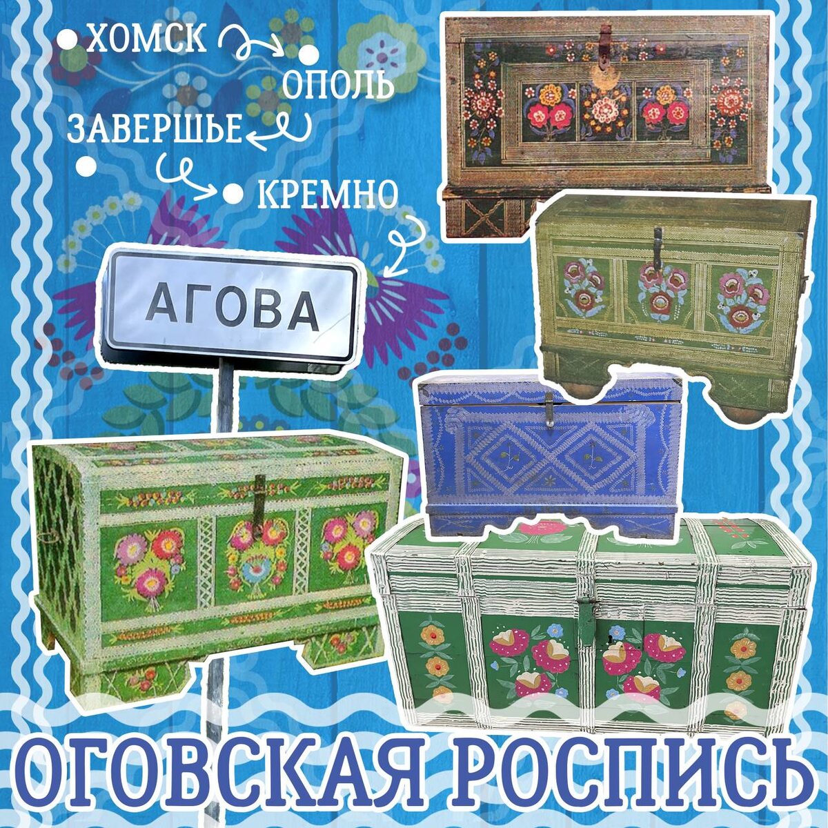 В поисках вдохновения для новой коллекции сувениров: исследуем расписные сундуки Западного Полесья - скрыни. В своём творческом поиске мы не раз обращались к теме Оговской росписи - уникальному художественному языку, выросшему из народных традиций и бытового декора. Скрыню родители заранее покупали для дочери, ставили на видное место и неспешно наполняли приданым. Его перевозили в дом жениха, где он гордо свидетельствовал о том, какая невеста - рукодельница, хозяюшка и вообще золото. А потом сундук мог служить и шкафом, и скамьей, и столом, а иногда кроватью. Многофункциональность задолго до IKEA. Брестская фабрика сувениров, не давая этому народному промыслу затухнуть, переосмысляла перенося Оговскую роспись на новые формы. В прошлом году было начато собственное расследование, чтобы вернуться к самым истокам росписи. Мы совершили экспедиции в самый Хартленд Западного Полесья, чтобы собрать натурный материал. На этой неделе мы начнем показывать результаты нашей работы - коллекцию к ист