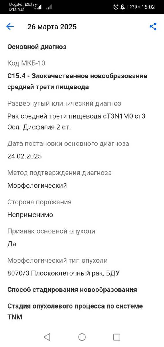 Всем привет, не писала достаточно долго, так как активно проходили исследования и записывались к врачам, новой информации не было. Сначала хочу ответить на вопросы из комментариев в прошлом посте и постараюсь приложить скрин из ЕМИАСа: У меня ранее не было диагнозов, связанных с пищеводом и желудком, операций на них и прочего. У меня был только 1 симптом - я летом 2024г. подавилась достаточно сильно, как будто еда просто перестала проходить в пищеводе, потом запила водой и все прошло, но было болезненно распирающее чувство в груди, как от большого куска еды. В следующий раз так активно проявилось в январе 2025г., пришлось даже делать мужу прием Геймлиха, потому что все застряло напрочь и не двигалось никуда, перекрыло дыхательные пути, я тогда очень испугалась, хорошо, что муж понял, что я задыхаюсь и спас мне жизнь. Позже пошла в поликлинику, меня отправили на ЭГДС, там же взяли биопсию, она и показала результат, его перепроверяли потом и делали тест на мутацию клеток, у меня все стан