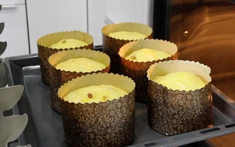 Через полчаса тесто должно подняться до верхнего края формы. Смазываем куличи смесью желтка и молока. Ставим выпекаться в разогретую до 170 градусов духовку примерно на полчаса или до появления румяной корочки. После выпекания даём куличам полностью остыть, затем покрываем глазурью или украшаем по желанию. Приятного аппетита и с праздником!