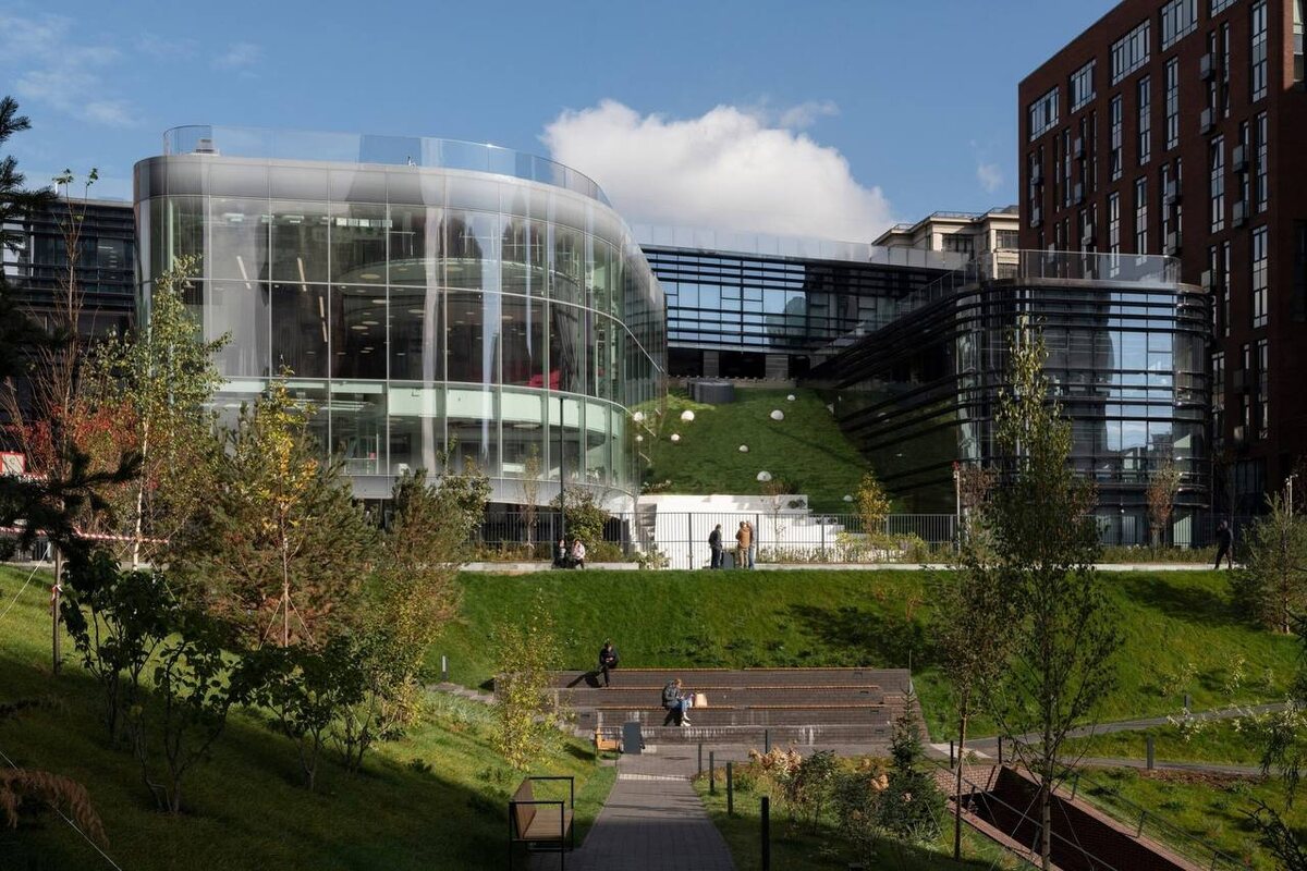 Школа «Садовых кварталов»исторически планировалась для школы при МГИМО; ..сейчас это самостоятельная частная школа «Новый взгляд» (учредитель – ГК «Регион»). Реализованный проект Юлия Борисова и архитектурной экосистемы UNK – результат конкурса, проведенного Москомархитектурой в 2020 году. Это последний по времени проект, который появился с составе «Садовых кварталов» и завершил собой формирование общественного пространства комплекса. Большая светящаяся консоль над прудом, внутри которой виден парящий амфитеатр и пересекающиеся в пространстве атриума, лестницы, несущие предназначенные для общения «островки». Склон с открытым амфитеатром похож на «протуберанец», продолжающий зелень парка вокруг пруда. Дорогое моллированное стекло с нанесенными методом шелкографии мини-эмблемами школы и керамические ламели с металлизированным отблеском подчеркивают технологичность здания.
