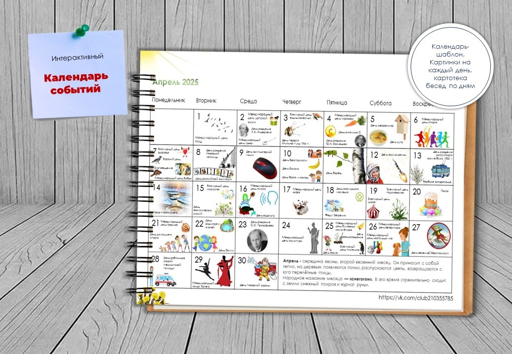 Интерактивный календарь событий НА АПРЕЛЬ 2025 года — это инновационное учебное пособие, разработанное специально для дошкольников. Он позволяет детям изучать события и праздники, происходящие в течение года. Календарь оснащен яркой графикой, интерактивными элементами, которые делают обучение увлекательным и познавательным.