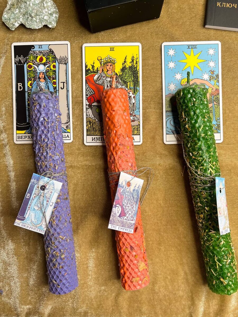 Свечи по женским СА Таро🎴💜 1️⃣Программная свеча «Верховная Жрица» Свеча с энергией старшего аркана Таро «Верховная Жрица». Энергия спокойствия, внутренней гармонии, магических способностей и интуиции. Возжигайте эту свечу во время своих ритуалов, практик, медитаций и работы с Таро. Цвет свечи: фиолетовый Растение: лаванда Эфирное масло: жасмин Камень: флюорит 2️⃣Программная свеча «Императрица» Свеча с энергией старшего аркана Таро «Императрица». Принесёт с собой красоту, женственность, изобилие, любовь к себе и опору на себя. Позволит почувствовать себя роскошной и красивой женщиной. Возжигайте эту свечу во время своих ритуалов, практик, медитаций и работы с Таро. Цвет свечи: розовый Растение: роза Эфирное масло: роза Камень: розовый кварц 3️⃣Программная свеча «Звезда» Свеча с энергией старшего аркана Таро «Звезда». Наполнит вас энергией радости, красоты, оптимизма и любви к жизни, подарит вдохновение и настройку на высокие вибрации. Возжигайте эту свечу во время своих ритуал