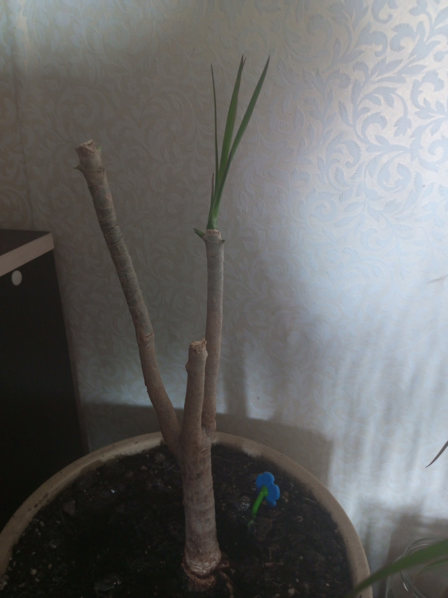 Обрезку лучше всего проводить ранней весной, в это время происходит активный рост и развитие растения. Обрезка с целью омоложения растения: Острым ножом обрежьте стебель на расстоянии 20-30 см от верхушки, в этом месте ствол должен быть одревесневшим, не зеленым. Если растение имеет один ствол, обрезку проводим так, чтобы осталось около 15-20 см от нижней части ствола. Вскоре возле места среза начнут появляться новые ростки. При наличии двух или более стволов каждый ствол обрежьте на разной высоте, чтобы обеспечить развитие розеток в пространстве. Если обрезать на одном уровне возможна конкуренция между розетками. Чтобы обеспечить оптимальные условия для роста, место обрезки можно укрыть пакетом, поддерживая влажность. Я не укрывала. Укоренение срезанных верхушек. Погрузите обрезки верхушек в кипяченую воду или раствор Корневина для стимуляции укоренения. У меня верхушки погруженные в воду, примерно через месяц дали корни. Можно укоренить и голый ствол, разрезав его на части по 15-