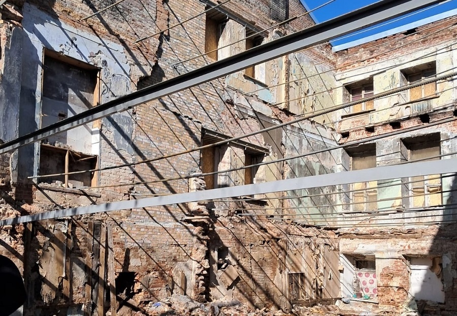 Сегодня глава администрации Кировского и Ленинского районов Ярославля Юрий Емец объявил о завершении работ. И показал, как выглядит объект культурного наследия «Дом Коковцевых-Лопатина» изнутри. Перекрытий там осталось мало, по сути, уцелел у здания только фасад.