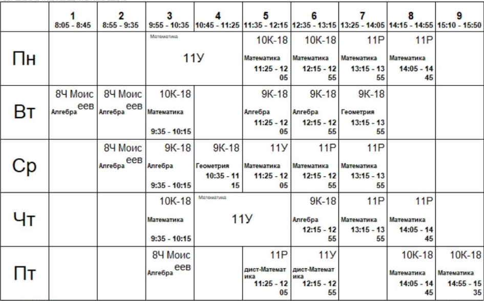 Кроме кадетских - два одиннадцатых - мой любимый 11Р, инженерный и 11У - универсальный. То есть один класс готовлю на ОГЭ и два - на ЕГЭ. И удаленные занятия 4 урока алгебры (с мальчиком-инвалидом) Нормальная нагрузка. Вот мое расписание:
