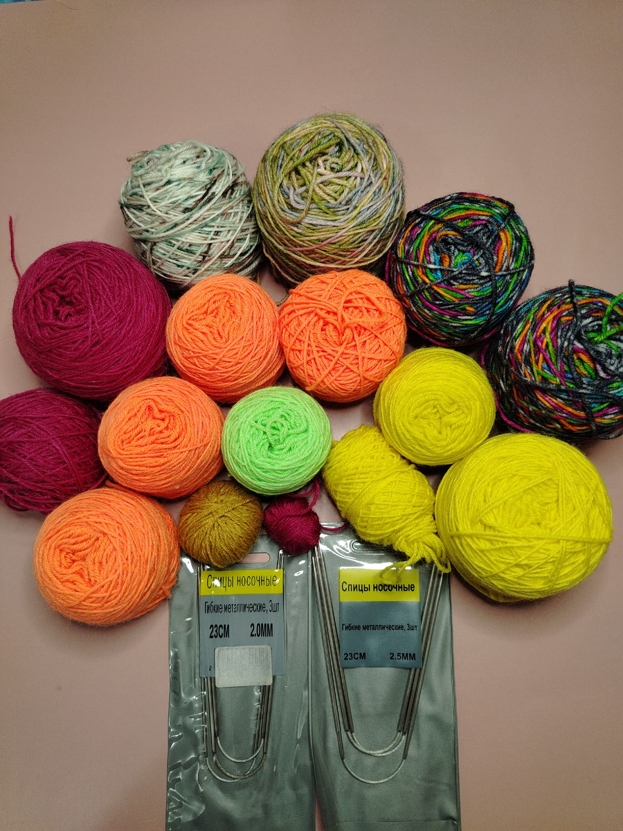 Наступил апрель и соответственно будут новые носки. В СП "Носочный календарь 2025" в этом месяце тема - "Пеппи длинный чулок". В голове сразу промелькнуло несколько мыслей: длинные? яркие? гольфы? Набрала ярких клубочков: Теперь буду думать как буду вязать. Так же нужно связать 2 пары носочков апреля. Решила опять извязать остатки. Один вариант: Нужно решить какой цвет будет основным. Второй вариант: Начинаем и вяжем, посмотрим что получится.
