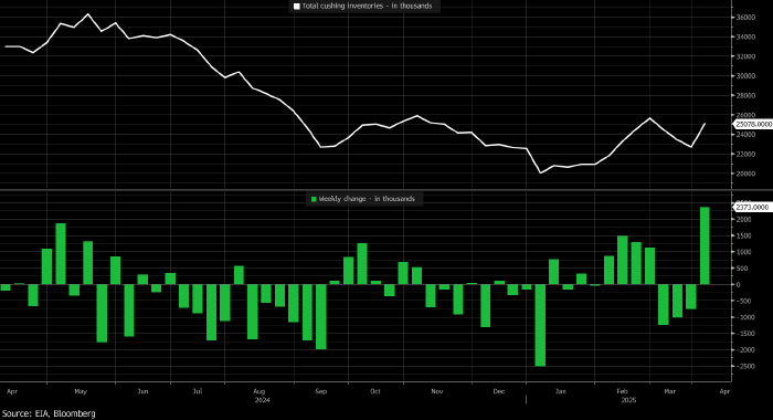 Запасы в Кушинге подскочили на 2,373 млн баррелей до 25,078 млн баррелей (рекордные значения с января 2023 года и февраля текущего года соответственно). Одновременно с этим общие коммерческие запасы сырой нефти в США прибавили 6,165 млн баррелей до 439,792 млн баррелей (рекордные значения с этого января и июля прошлого года соответственно)