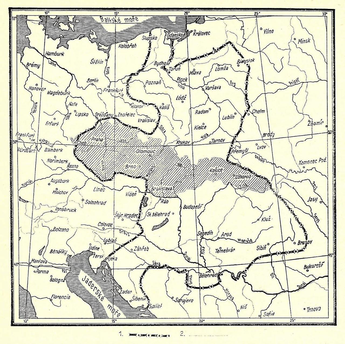 Это продолжение цикла о формировании современных границ Чехии и Словакии. Начало – здесь. Сегодня такая воинственная карта из книги 1937 г. Válečné dějiny československé (Чехословацкая военная история): Показывает максимальное распространение политического влияния Чехии на рубеже XIII-XIV веков, а также современные границы государств. Богемия, бесспорно, была важнейшей державой региона, но вот эти жирные границы от Балтики до Адриатики немного лукавы. Карта отражает положение дел с июня по декабрь 1305 г., когда 17-летний Вацлав III уже унаследовал от отца чешскую и польскую корону, но еще не отказался от венгерской. И этот непродолжительный период был единственным, когда Чехия, Польша и Венгрия находились под властью одного монарха. А вот король Венгрии Людовик Великий правил Польшей целых 12 лет (1370 – 1382), и авторы современного венгерского исторического атласа по традиции сделали соответствующую вставку: Для гурманов версия 1890 года: В свою очередь, четыре года правил Венгрией п
