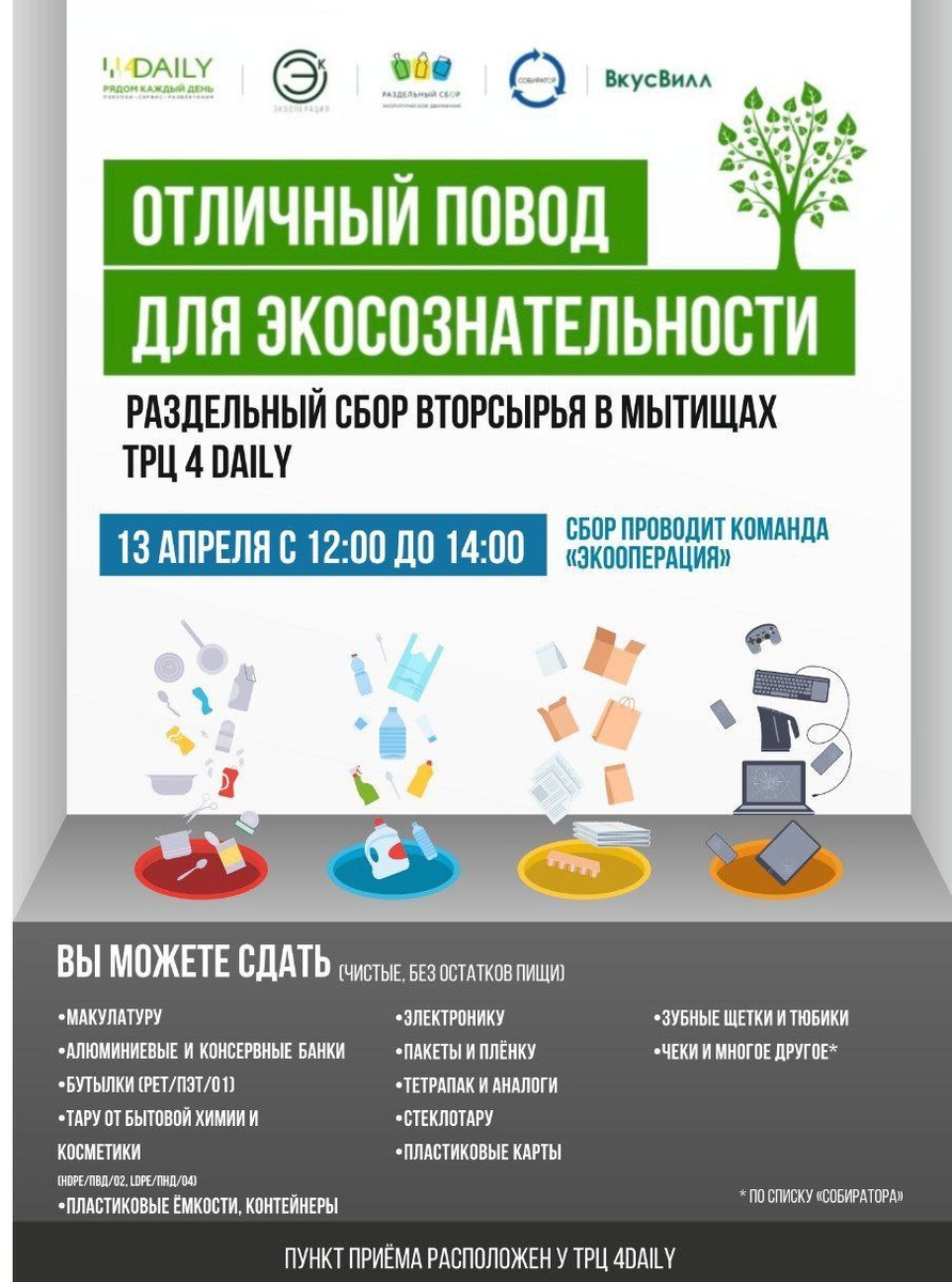 Мытищи. 13 апреля с 12:00 до 14:00 около ТЦ 4DAILY - акция по раздельному сбору вторсырья.