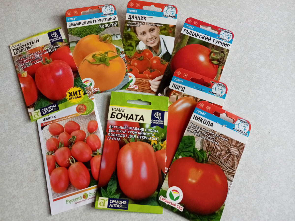 При покупке семян выбираю детерминантные сорта , то есть с ограниченным ростом, для открытого грунта. Выращиваю я обычно от 7 до 10 сортов, из них бывает половина тех, которые уже выращивала, и половина, которые буду выращивать впервые. Это для подстраховки, если новые не вырастут, без урожая не останусь за счет проверенных сортов. Также стараюсь растить помидоры с разной формой плодов: круглые и овальные.