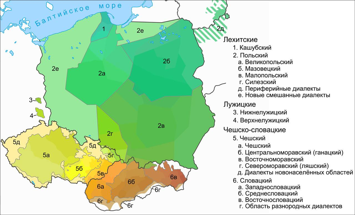 Восточноморавские диалекты чешского (которые также называют моравско-словацкими) плавно перетекают в западнословацкие. А североморавские (они же ляшские, laskie на карте ниже) диалекты чешского демонстрируют черты, роднящие их с польским (например, отсутствие долготы гласных и ударение на предпоследнем слоге):