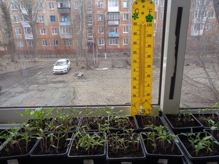 Весной все подоконники в квартирах моих знакомых заставлены горшочками и баночками с растениями. Наступит день, когда их увезут на дачу и пересадят на грядку или в теплицу. Но до этого благословенного момента ещё не меньше 2 месяцев. Между тем, квартира – далеко не самое подходящее место для рассады. Садовым растениям в ней чересчур жарко и темно. Но, оказывается, в моей квартире есть место, где рассада чувствует себя великолепно. И я его нашла. В марте и апреле коммунальщики топят так, что к батареям трудно подойти. Комнатный гигрометр показывает влажность воздуха 26% -- практически как в пустыне. Я постоянно открываю окна, чтобы не было так жарко. Морозный воздух залетает в комнаты сквозняками, высушивая всё вокруг. Неудивительно, что в таких условиях помидорная, перечная и баклажанная рассада у меня всегда вытягивалась, была тонкой, слабой и хилой. Пишу в прошедшем времени, потому что эти проблемы остались в прошлом. Сейчас в условиях квартиры у меня происходит только один этап про