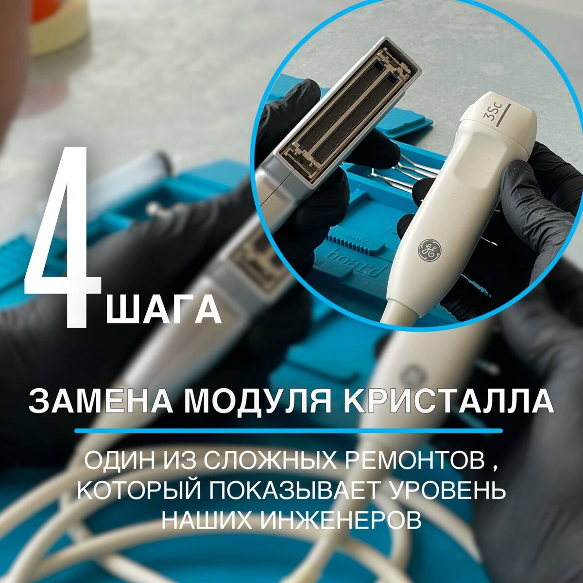 Замена пьезокристалла — один из самых сложных видов ремонта ультразвуковых датчиков. И мы в Medford умеем это делать. Недавно к нам попал датчик 3Sc-RC, который раньше отправили бы на восстановление в Китай. Но теперь такую работу выполняют наши инженеры — в России. И делают это не хуже, а местами даже лучше. Восстановление прошло в 4 ключевых шага: Шаг 1: Разбор датчика Аккуратно вскрываем корпус и отделяем все внутренние элементы. Здесь главное — точность и аккуратность. Шаг 2: Замена модуля пьезокристалла Самое тонкое и технологичное. Именно пьезоэлементы формируют изображение — и если с ними проблема, датчик «слепнет». Мы полностью заменили модуль. Шаг 3: Сборка датчика Все компоненты соединяются обратно, как часы. Работа с экранирующими материалами и пайка проводов требуют ювелирной точности. Шаг 4: Герметизация Наносим специальный состав, чтобы надёжно изолировать внутренности от влаги и пыли. Без этого шаг пропустить нельзя — иначе даже самый точный ремонт не продержится.