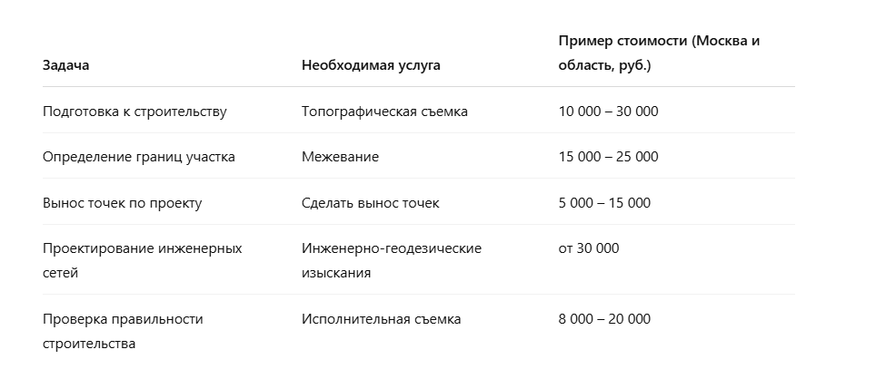 📌 Пример экономии: вместо отдельного заказа на топографическую съемку (20 000 руб.) и межевание (15 000 руб.), можно заказать их вместе за 30 000 руб.