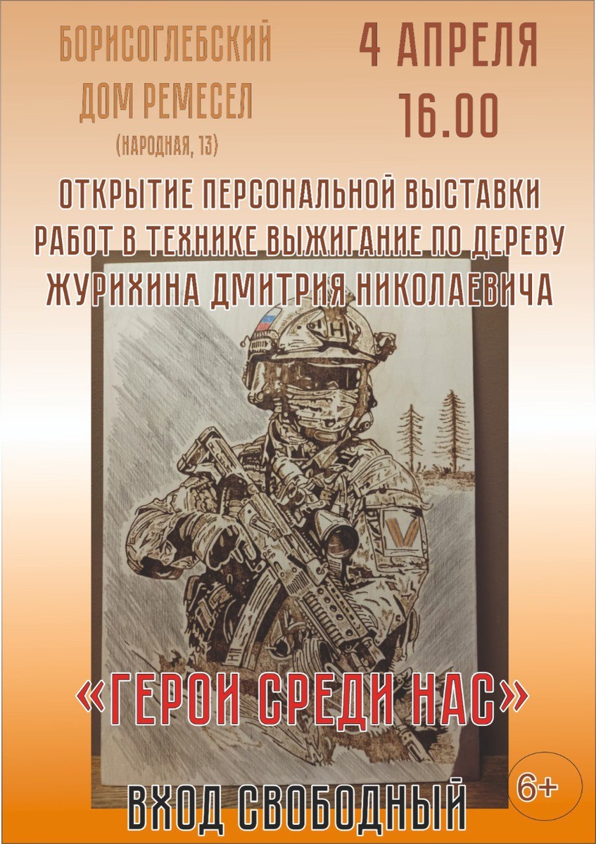 4 апреля в 16.00 в Борисоглебском Доме ремесел откроется персональная выставка Дмитрия Журихина «Герои среди нас». На ней будут представлены уникальные работы мастера, выполненные в технике выжигания по дереву. Приглашаются все желающие. Вход свободный.